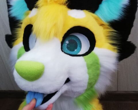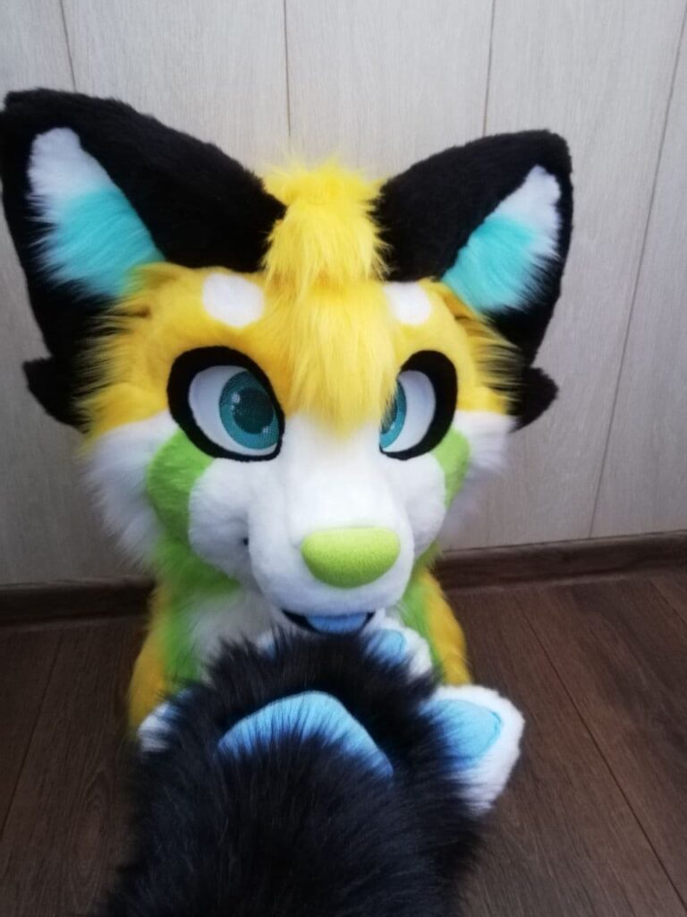 This is an insanely cute and beautiful fursuit, the red panda Poky! In yellow colors and with high quality fur!